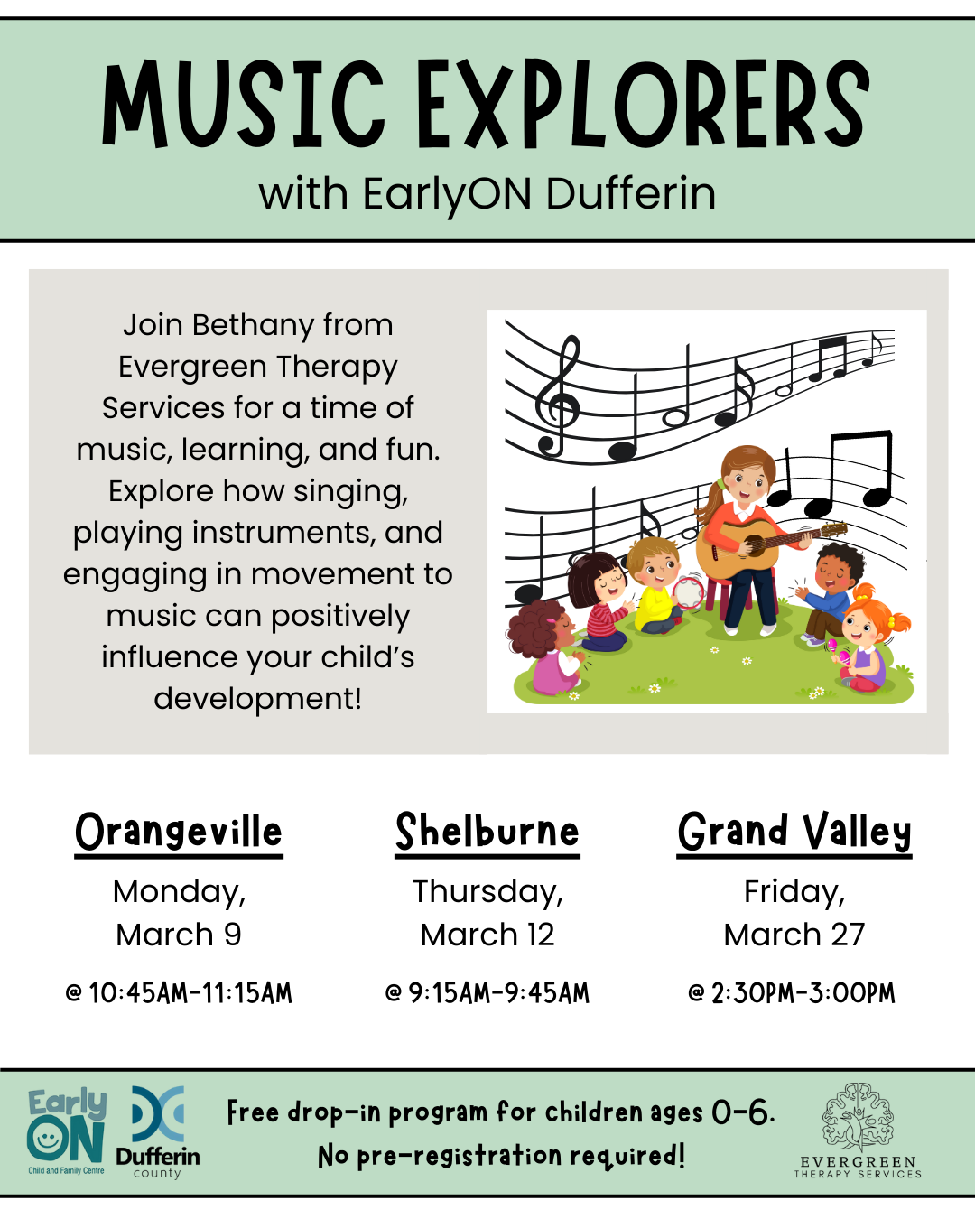 At Evergreen Therapy Services, we are excited to partner with other local organizations to provide free/low-cost music programs for individuals of all ages and abilities. If you or your organization are interested in partnering with us to provide custom programs for residents of Dufferin County, please contact us today! We would love to connect with you.